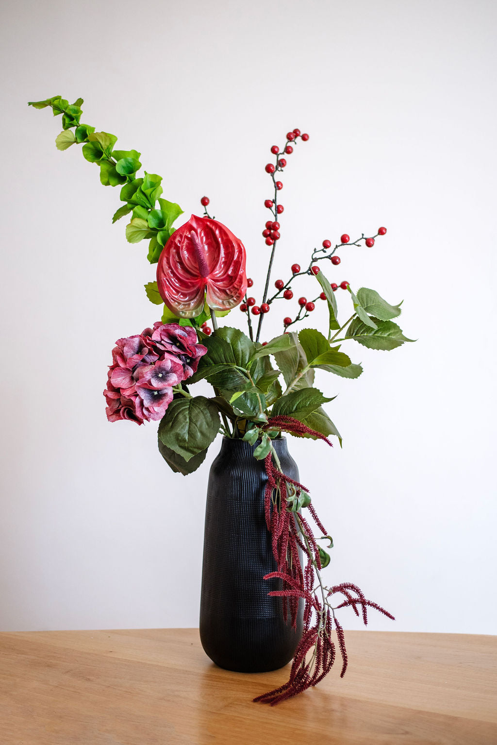 Ce bouquet raconte une histoire, celle d’un instant suspendu entre mystère et douceur. Ses fleurs rouge profond et ses touches de vert lumineux composent une scène pleine de contraste, comme un souvenir vibrant que le temps n’efface pas.