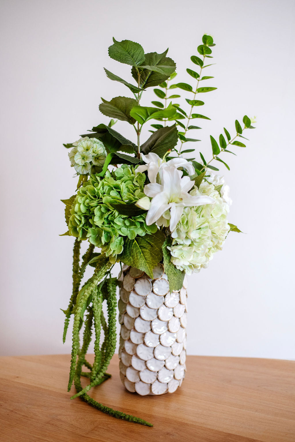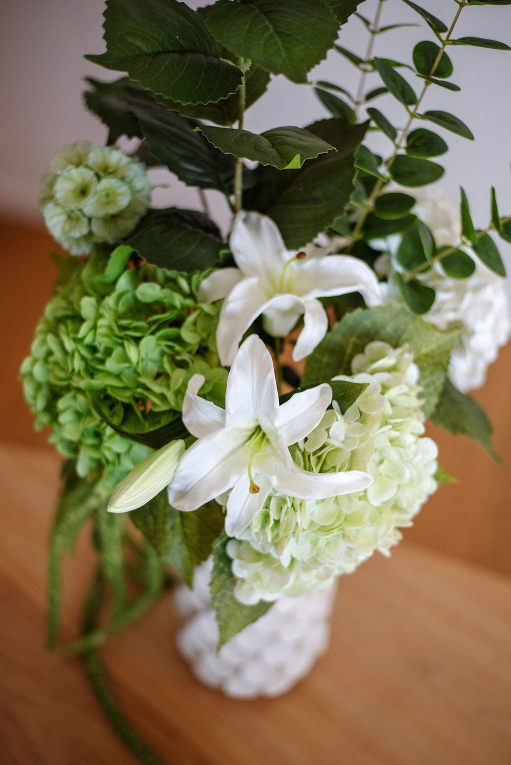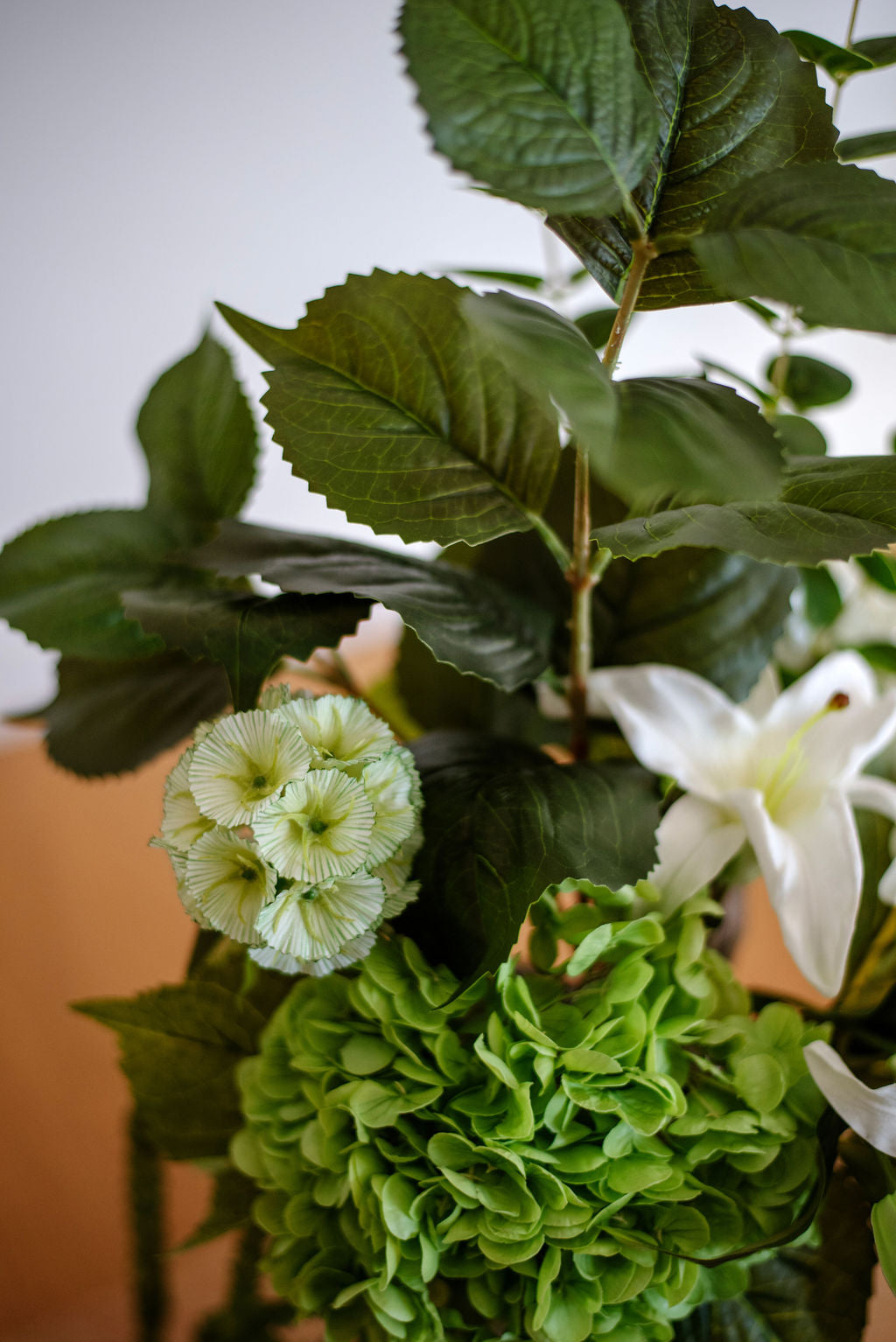 Ce bouquet respire le renouveau, comme une fenêtre ouverte sur les premiers jours du printemps. Ses verts frais et ses blancs lumineux évoquent l’air clair du matin, les jardins qui s’éveillent, les draps qu’on fait sécher dehors. Chaque tige semble capter un souffle de nature — pur, léger, presque joyeux — qui adoucit la pièce et diffuse une clarté apaisante.