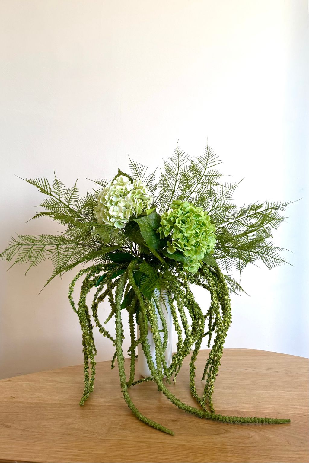 Ce bouquet installe une atmosphère calme et végétale, comme un souffle de nature ramené à l’intérieur. Il habille une table basse ou un buffet d’une élégance sobre et organique.